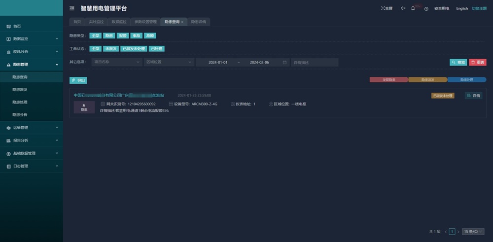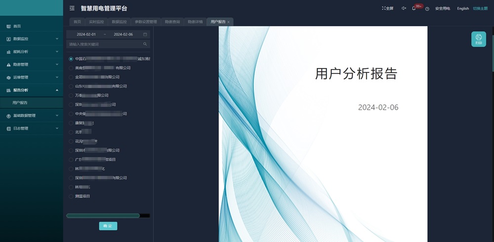 平臺進行大數據分析,生成對應項目的用戶報告,為領導制定電氣安全整頓計劃和能耗節約方案提供依據和參考。