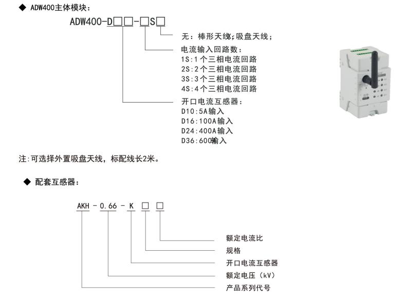 ADW400環保監測模塊主要用于計量低壓網絡的三相有功電能,同時可選擇四個回路的電流輸入,具有RS485通訊和470MHz無線通訊功能,方便用戶進行用電監測、集抄和管理。可靈活安裝于配電箱內,實現對不同區域和不同負荷的分項電能計量,統計和分析。