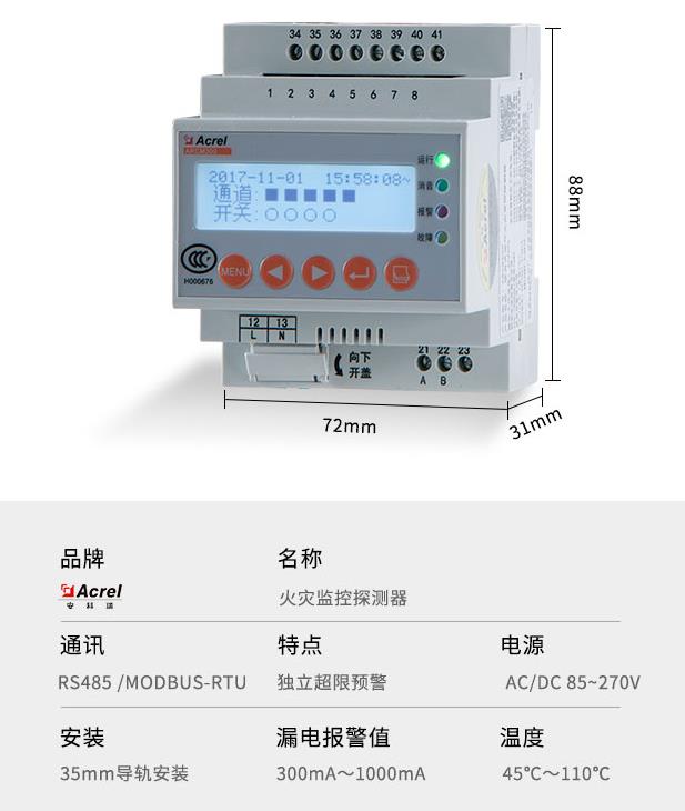 智慧用電在線監控裝置是針對0.4kV以下的TT、TN系統設計的智能電力裝置,具有單、三相交流電測量、四象限電能計量、諧波分析、開關量輸入、繼電器輸出功能,以及RS485通訊或GPRS無線通訊功能,通過對配電回路的剩余電流、導線溫度等火災危險參數實施監控和管理。