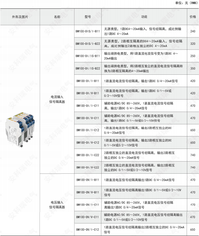 BM100系列信號隔離器可以對電流、電壓等電量參數或溫度、電阻等非電量參數進行快速準確測量,經隔離轉換成標準的模擬信號輸出。既可以直接與指針表、數顯表相接,也可以與自控儀表(如PLC)、各種A/D轉換器以及計算機系統等設備配接。