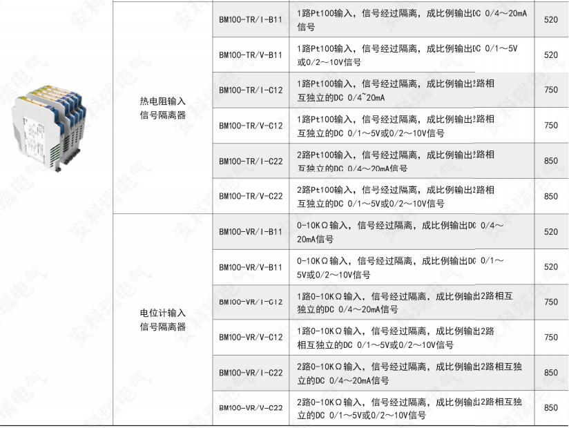 BM100系列信號隔離器可以對電流、電壓等電量參數或溫度、電阻等非電量參數進行快速準確測量,經隔離轉換成標準的模擬信號輸出。既可以直接與指針表、數顯表相接,也可以與自控儀表(如PLC)、各種A/D轉換器以及計算機系統等設備配接。