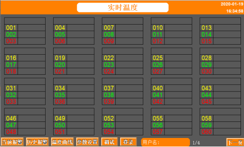 觸摸屏上電進入工作狀態后,默認即為“實時溫度”界面,再此界面可觀察到各節點采集的溫度值。