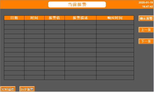 可查看“當前報警”和“歷史報警”事件。有報警時,“當前報警”顯示出報警提示,并觸發蜂鳴器,此時確認報警,蜂鳴器停止鳴叫,同時報警提示的字體變為藍色,當報警故障消除后,報警提示消失。