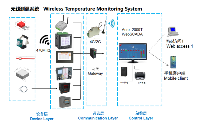 無線溫度傳感器與主機信息交換通過無線信號傳送,不會影響系統(tǒng)的絕緣性能,使用安全。無線測溫系統(tǒng)主要適用于工業(yè)領域,可對高壓電纜接頭及高壓開關柜觸點等處溫度進行實時監(jiān)測,方便運維人員遠程掌握現(xiàn)場運行情況。