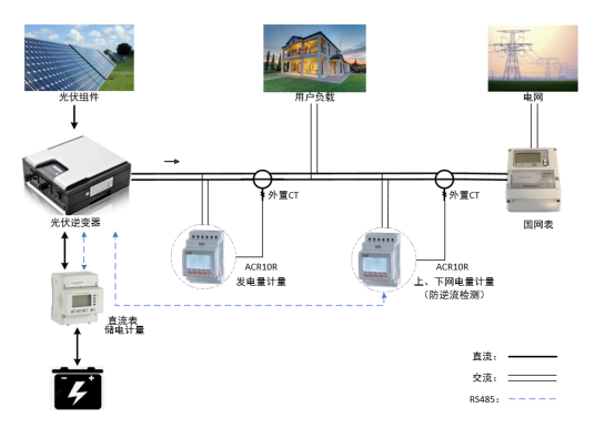 但也有部分國(guó)家并不允許私人光伏發(fā)電輸入到電網(wǎng)當(dāng)中或者說不會(huì)對(duì)私人光伏發(fā)電設(shè)施對(duì)電網(wǎng)供電提供補(bǔ)貼,此時(shí)的用戶為盡量延長(zhǎng)設(shè)備壽命往往會(huì)采用完全自發(fā)自用模式,即多用多發(fā)、少用少發(fā)。這種模式下智能電能則需要為逆變器提供實(shí)時(shí)雙向功率、電能來支持逆變器的儲(chǔ)能判斷功能和防止其向電網(wǎng)供電。