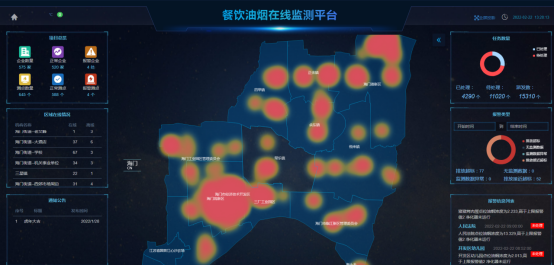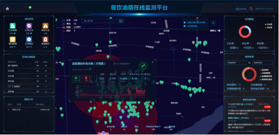 全屏展示界面UI可定制,顯示內(nèi)容可根據(jù)需求調(diào)整;地圖點位可根據(jù)監(jiān)測狀態(tài)以不同顏色區(qū)分,根據(jù)區(qū)域內(nèi)油煙濃度情況,劃分不同熱力區(qū)塊,凸顯主要區(qū)域,地圖可顯示省控點周邊1km和3km區(qū)域范圍。