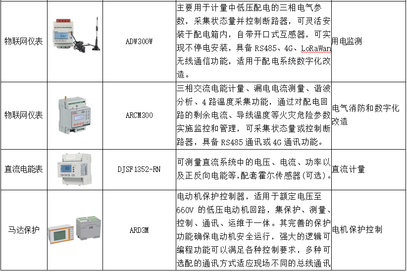 3.5 儲能管理 監(jiān)測儲能系統(tǒng)、電池管理系統(tǒng)(BMS)和儲能變流器(PCS)運(yùn)行,包括運(yùn)行模式、功率控制模式,功率、電壓、電流、頻率等預(yù)定值信息、儲能電池充放電電壓、電流、SOC、溫度,根據(jù)企業(yè)峰谷特點(diǎn)和電價(jià)波動(dòng)以及上級平臺指令設(shè)置儲能系統(tǒng)的充放電策略,控制儲能系統(tǒng)充放電,實(shí)現(xiàn)削峰填谷,降低企業(yè)用電成本。 3.6 充電樁運(yùn)營管理 監(jiān)測企業(yè)充電樁的運(yùn)行狀態(tài),提供充電樁收費(fèi)管理和狀態(tài)監(jiān)測功能,并根據(jù)企業(yè)負(fù)荷曲線和變壓器負(fù)荷率調(diào)節(jié)充電樁的充電功率,引導(dǎo)有序充電,使企業(yè)能源系統(tǒng)穩(wěn)定安全運(yùn)行。 4 企業(yè)能源管理系統(tǒng)硬件設(shè)備 安科瑞針對企業(yè)能源管理數(shù)字化系統(tǒng)除了軟件外,還具備現(xiàn)場傳感器、智能網(wǎng)關(guān)等設(shè)備,組成了完整的“云-邊-端”數(shù)字化體系,具體包括高低壓配電綜合保護(hù)和監(jiān)測產(chǎn)品、電能質(zhì)量在線監(jiān)測裝置、電能質(zhì)量治理、照明控制、新能源充電樁、電氣消防類解決方案等,可以為企業(yè)能源管理系統(tǒng)建設(shè)提供一站式服務(wù)能力,部分設(shè)備見表1。 5 結(jié)束語 面向未來,AcrelEMS企業(yè)能源管理系統(tǒng)將結(jié)合行業(yè)特點(diǎn)、服務(wù)“雙碳”目標(biāo),積極利用安科瑞“云-邊-端”的產(chǎn)品體系和能源管理數(shù)字化技術(shù)積累幫助企業(yè)改造傳統(tǒng)電網(wǎng),加快推動(dòng)企業(yè)用能向更加智慧、更加安全、更加友好的能源數(shù)字化升級,為促進(jìn)生態(tài)文明建設(shè)作出持續(xù)貢獻(xiàn)。
